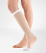 Een witte onderkous van huidvriendelijk materiaal met een lage druk houdt het wondverband vast op het been en beschermt de gevoelige huid tegen irritatie. De beige bovenkous kan hier gemakkelijk over aangetrokken worden. Het gepatenteerde geruite breiwerk oefent de voor de behandeling noodzakelijke druk uit en maakt makkelijk aan- en uittrekken mogelijk.